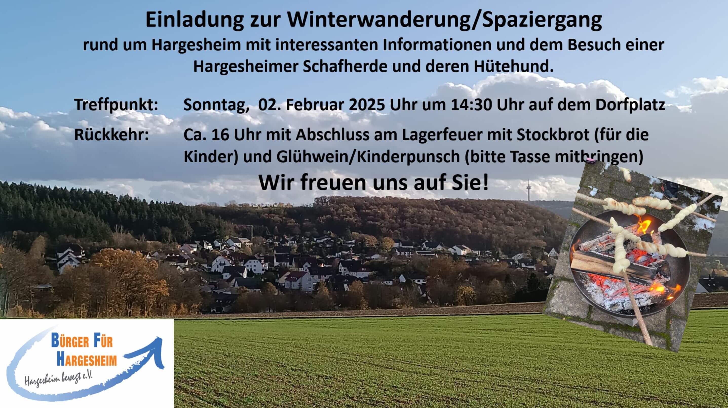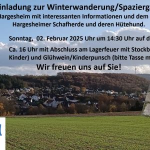 Am Sonntag, den 02.02.2025 laden die Bürger für Hargesheim e.V. (BfH) zur diesjährigen Winterwanderung ein. Treffpunkt ist um 14.15 Uhr auf dem Dorfplatz, auf dem die Tour nach einer Runde durch die Hargesheimer Gemarkung auch wieder gegen 15:45 Uhr enden wird. Unterwegs gibt es Gelegenheit die wunderschöne Landschaft rund um Hargesheim zu erleben, Informationen zu neuen Projekten aus erster Hand zu erfahren oder einfach nur mit netten Menschen einen schönen Spaziergang zu genießen. Ein Höhepunkt wird auch der Besuch bei den Hargesheimer Schafen sein, bei den wir auch einen Hütehund in Aktion erleben werden.